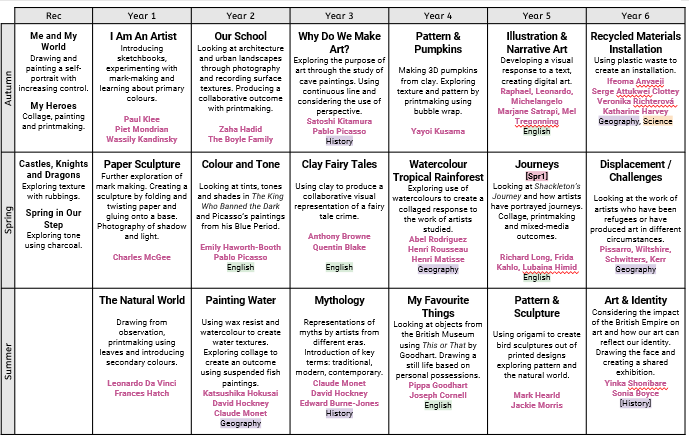 The Art curriculum provides children with the opportunity to explore historical and contemporary artists and artworks, who represent their own and others’ cultures, values and beliefs. We will explore the context in which the art was produced, and consider the full breadth of human experience and expression through art.