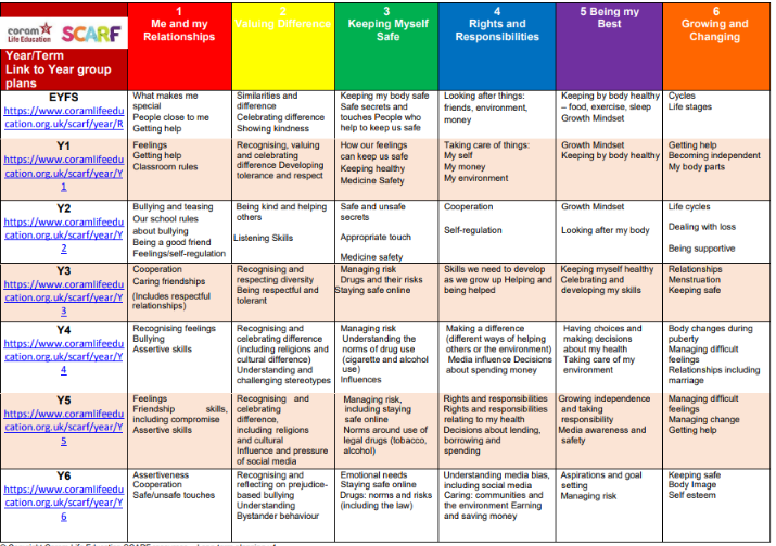 PSHE is taught through weekly lessons from Reception to Year 6. The SCARF curriculum provides a clear progression of learning across the following areas: