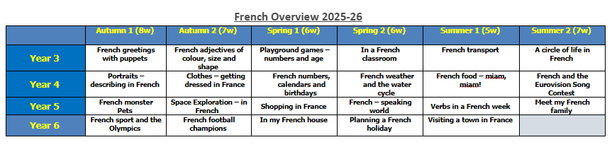We use the Kapow Primary French Scheme, which provides a clear, progressive and engaging approach to teaching French across Key Stage 2. This ensures that pupils experience high‑quality language teaching built around authentic contexts, interactive activities and opportunities for meaningful communication.